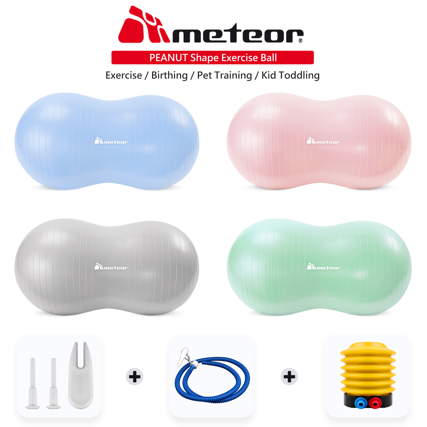 Kit Includes: 1x Peanut Ball / 1x Foot Pump / 2x Air Plugs / 1x Plug Remover